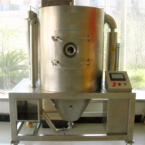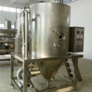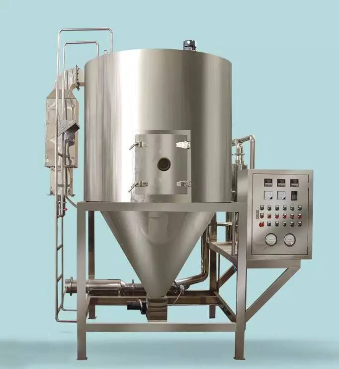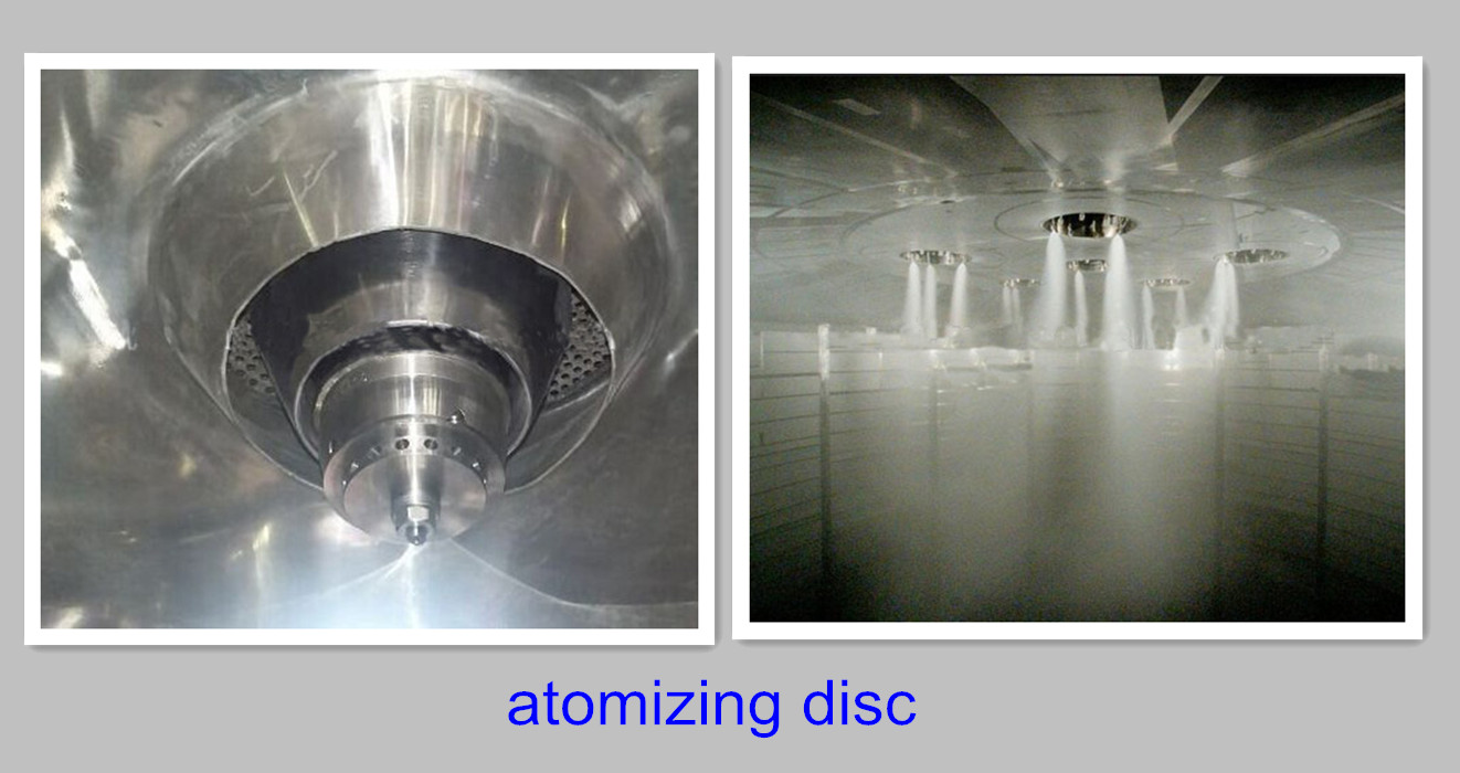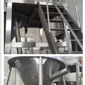 After fresh air is filtered and heated, it enters into the air distributor which on the top of the drier. The hot air in spiral form equably enters into the drying room. When liquid raw material are passed through the high-speed centrifugal sprayer on the top of the tower, it will be rotated and sprayed into the extreme slim mist liquid beads. Raw material can be dried to the final products instantly while it contact with the heatedair. Finished products are discharged continuously from bottom of the drying tower and cyclones segregator. Wasted air is discharged from blower.