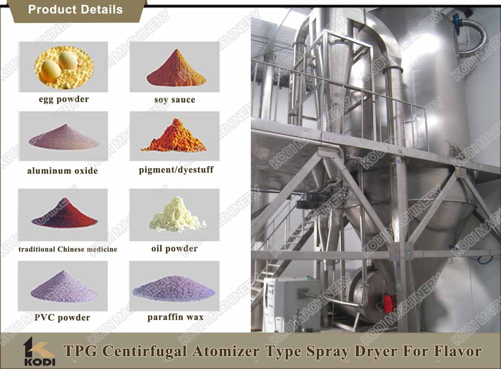 It's widely used in foodstuff, pharmaceutical and chemical industry, such as egg powder, amino acid product, protein, blood, food flavor, food ingredients, pectin, carrageenan, spirulina, herbal extraction, pigment, cocoa, mushroom, PAC, malt dextrin, collagen, juice , yeast, Coffee, Creamer, coconut, milk, gelatin, gum and acacia etc.