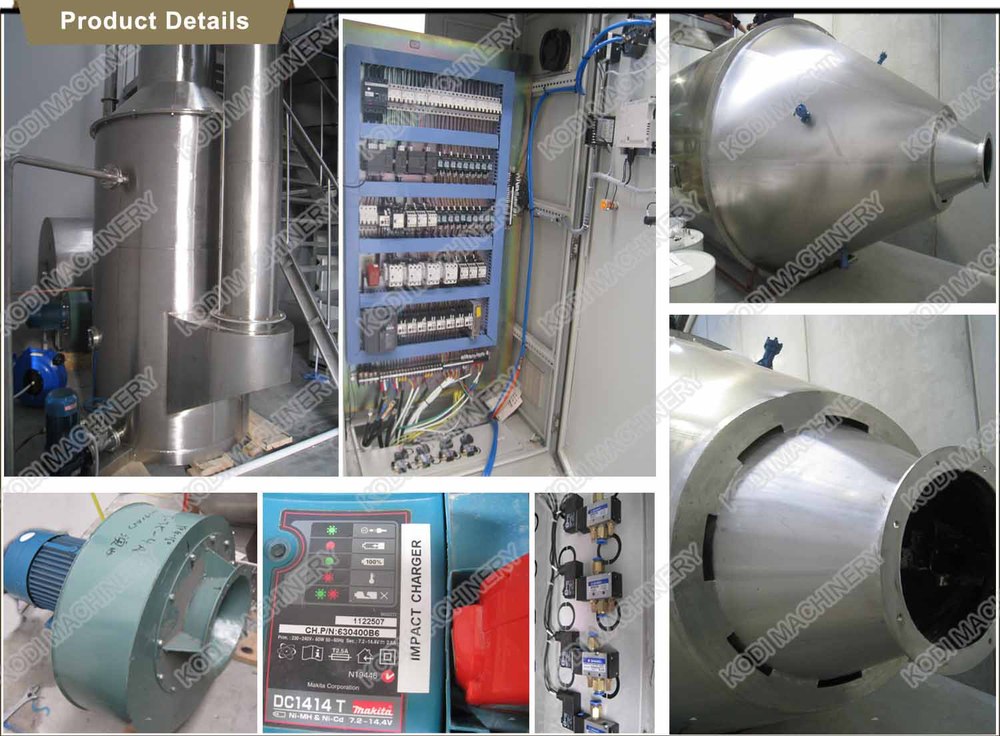 After filtering and heating, the hot fresh air enter into the air distributor at the top of drying chamber, distributed in spiral way uniformly from up to down. At the same time, the feeding liquid is pumped to the top atomizer, then be sprayed to extremely fine mist liquid drop. Through the short time of direct contact with hot air, the moisture evaporated at once, the solid remains to be powder. The dry powder will be discharged continuously from the bottom of drying tower and cyclone collector, the exhaust air will be discharged after cleaning.