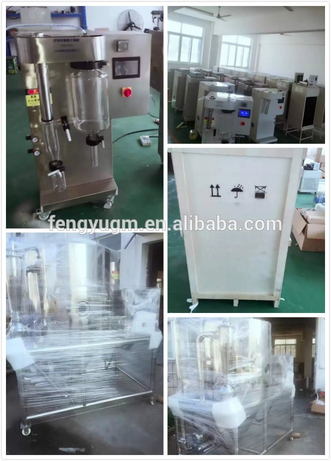 FENGYU Laboratory spray dryer according to different spray drying nozzle could classify as two-fluid spray dryer and centrifugal spray dryer, if you use it it in laboratory or small scale product, suggest choose two-fluid spray drying machineand its capacity is 1500ml/h to 3000ml/h, if you need 3000ml/h, 5000ml/h, 10000ml/h and larger capacity please choose centrifugal spray drying equipment.