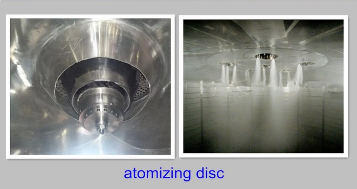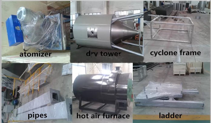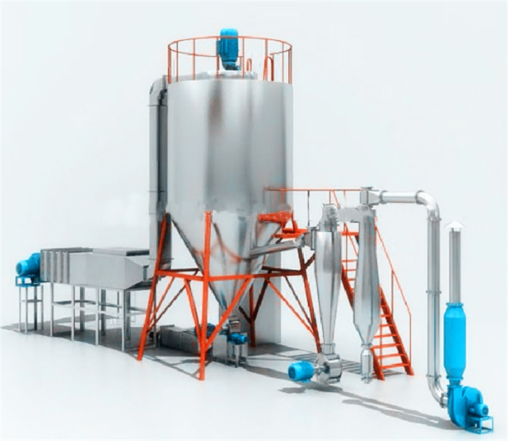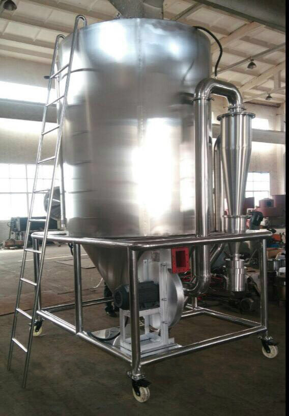After fresh air is filtered and heated, it enters into the air distributor which on the top of the drier. The hot air in spiral form equably enters into the drying room. When liquid raw material are passed through the high-speed centrifugal sprayer on the top of the tower, it will be rotated and sprayed into the extreme slim mist liquid beads. Raw material can be dried to the final products instantly while it contact with the heatedair. Finished products are discharged continuously from bottom of the drying tower and cyclones segregator. Wasted air is discharged from blower.