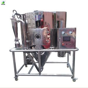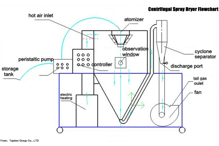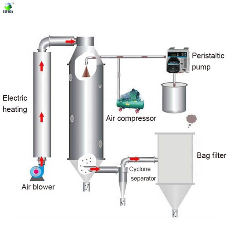 Air through the filter and heating devices come into the hot air distributor which is at the top of drying chamber, the hot air distributor produce hot air, then hot air come into drying chamber evenly and move spiraling, at the same time, delivery liquid material to the centrifugal spray head which is equipped at the top of drying chamber, the liquid material is sprayed as fog droplet, so as to increase the contraction surface area of liquid material and hot air, moisture to evaporate quickly, dry products within a very short time. Coarser product is collected by collection barrel which is at the bottom of dryer, waste gas discharged by centrifugal fan.