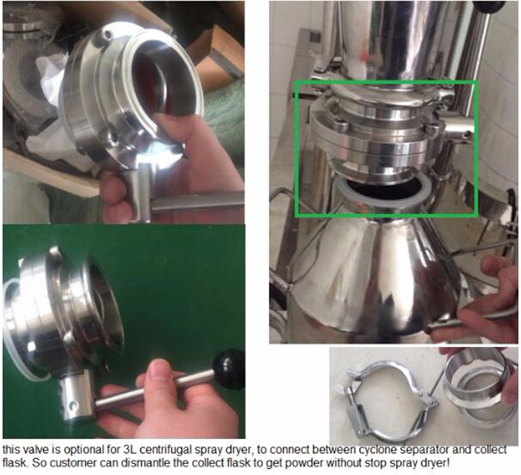 2. Adopt parallel flow pattern of spray drying, during drying process, the temperature of the liquid droplet is not high, which promise high quality products. In the spray drying chamber, liquid droplet and hot air flow with same direction, although the temperature of hot air is some higher, but as hot air immediately contact with the spray liquid droplet after it come into drying chamber, the temperature of drying chamber is dip down, so will not make the dry material overheating, and suitable for drying of thermal sensitive material, the temperature of discharge product depends on the exhaust temperature, and lower than exhaust temperature.
