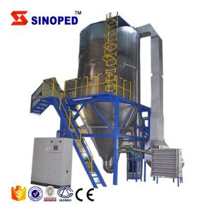 After been filtered and heated the Air enters into the air distributor on the top of the dryer .The Hot Air enters into the drying room in the spiral form and uniformly. Passing through the high-speed centrifugal Sprayer/Atomizer on the top of the tower, the material liquid will rotate and be sprayed into the extremely fine mist liquid beads .Through the very short time of contacting the heat air, the materials can be dried into the Final products .The final products will be Discharged continuously from the bottom of the drying tower and from the cyclones. The waste gas will be discharged from blower.