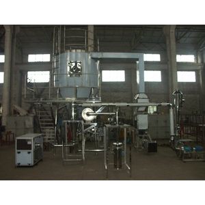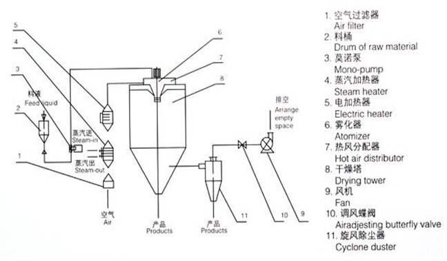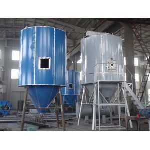 After been filtered and heated the air enters into the air distrbutor on the top of the dryer.The hot air enters into the drying room in the spiral form and uniformly. Passing through the high-speed centrifugal sprayer on the top of the tower,the material liquid will rotate and be sprayed into the extremely fine mist liquid beads.Throug the very short time of contacting the heat air,the materials can be dried into the final products.The final products will be discharged continuously from the bottom of the drying tower and from the cyclones. The waste gas will be discharged from blower.