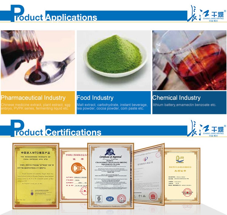 ZLPG Chinese Herbal Medicine Extract Spray Dryer Pharmaceutical Extractor Machine adopts full seal from.All parts are made of stainless steel.It is equipped with three grades of filter.The filtered air is one hundred thousand grades.The cooling device of wall is installed at the cylinder body.It makes the wall temperature less than 80℃.Air sweeping device is installed inside the drying tower. The product will not be burnt or deteriorated even stays on the way.The collection rate of powder is raised greatly.Moreover will not cause medicine mixed or wall stick.