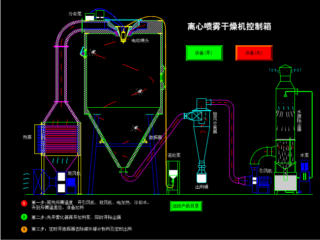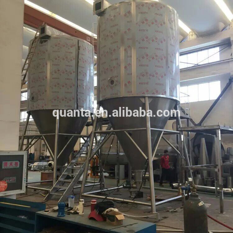 After been filtered and heated the air enters into the air distributor on the top of the dryer .The hot air enters into the drying room in the spiral form and uniformly. Passing through the high-speed centrifugal sprayer on the top of the tower, the material liquid will rotate and be sprayed into the extremely fine mist liquid beads .Through the very short time of contacting the heat air, the materials can be dried into the final products .The final products will be discharged continuously from the bottom of the drying tower and from the cyclones. The waste gas will be discharged from blower.