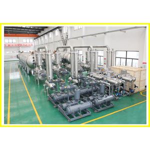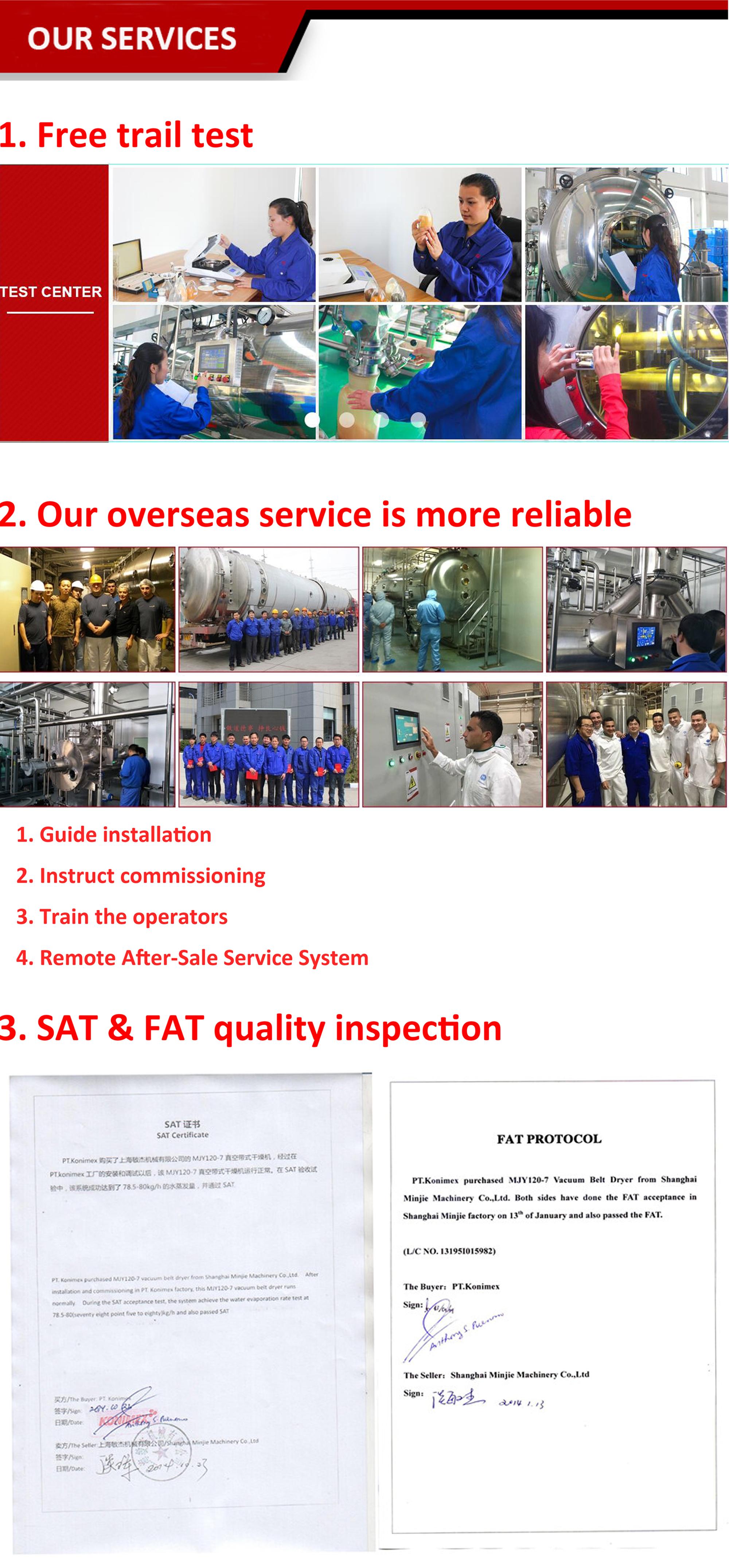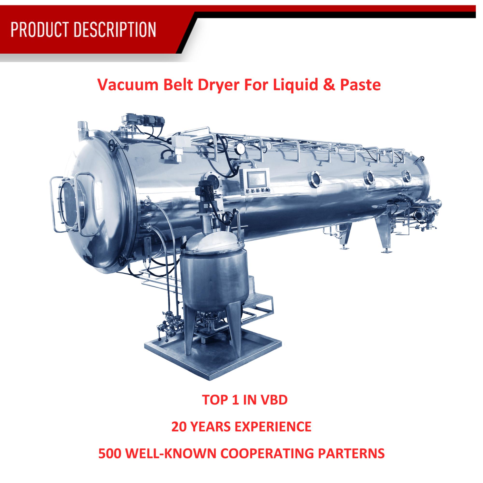 Vacuum belt dryer is a continuous infeed and discharge vacuum drying equipment. Liquid product is conveyed into dryer body by infeed pump, evenly spread on belts by distribution device. Under high vacuum, the boiling point of the liquid is lowered; water in the liquid material is evaporated. Belts move on the heating plates evenly. Steam, hot water, hot oil can be used as heating media. With the moving of the belts, the product goes through from the beginning evaporating, drying, cooling to discharging in the end. The temperature decreases through this process, and can be adjusted for different products. Special vacuum crusher is equipped at the discharge end to produce different size end product. The dry powder or granule product can be automatically packed or continue with subsequent process.