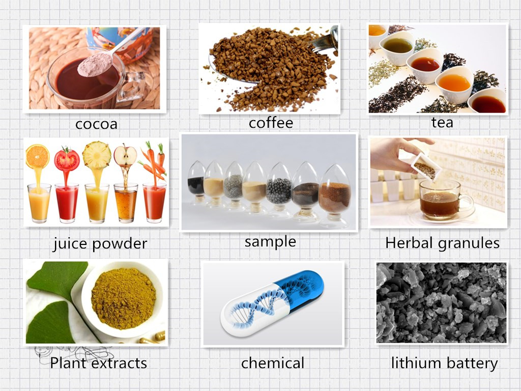 1. Food industry (malt extract, carbohydrate, instant beverage, tea powder, cocoa powder, corn paste etc) 2. Pharmaceutical industry (chinese medicine extract, plant extract, egg embryo, PVPK series, fermenting liquid etc) 3. Chemical Industry (lithium battery, emamectin benzoate etc)