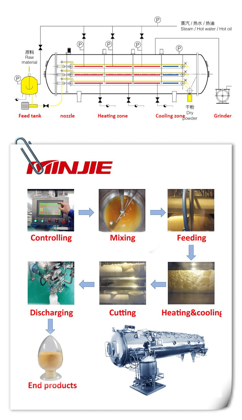 1.Less labor cost and energy consumption 2.Little loss of product and solvent recycling possible 3. PLC automatic control system & CIP cleaning system 4. GMP standards 5. Good solubility & excellent quality of the products 6. Continuous feed-in, dry, granulate, discharge in vacuum state 7. Completely closed system and no contamination 8. Adjustable drying temperature (30~150℃)& drying time (30~60min)