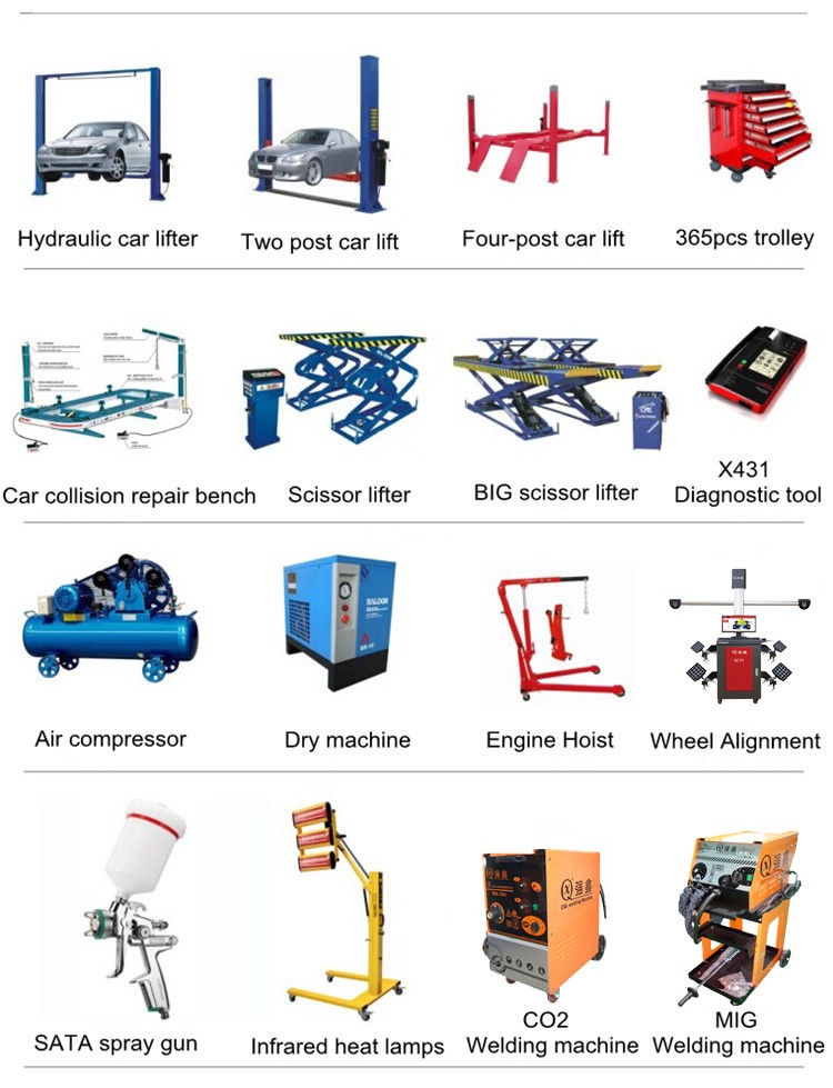 We also supply wide range of vehicle repaire&maintenance equipments such as auto car lift,frame machine,air compressor,welding machine,tire changer,wheel balancer,wheel alignment ect..