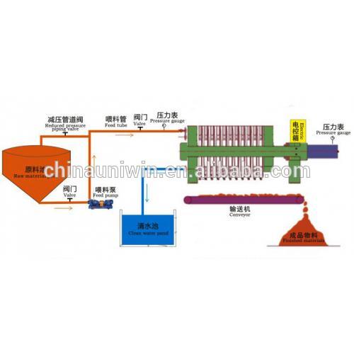 The mixture slurry is pumped through the mediating medium(filter cloth) ,the solid will stay in the filter chamber formed by two filter plates and gradually pile up on the filter cloth to form a filter cake. and the liquid part is permeable to filter cloth, then the clear liquid that contains no solid flow out of the filter press.