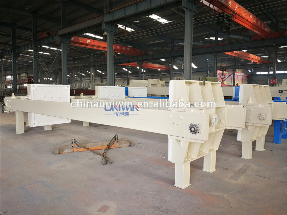 Workshop: the filter press frame is welded by high quality solid steel Q235 and Q345.the frame is the basic part of the filter press, both top are the thrust plate and pressed plate. the two part are connected by the both side crossbeam. the crossbeam is used to support the filter plate, filter frame and press plate.