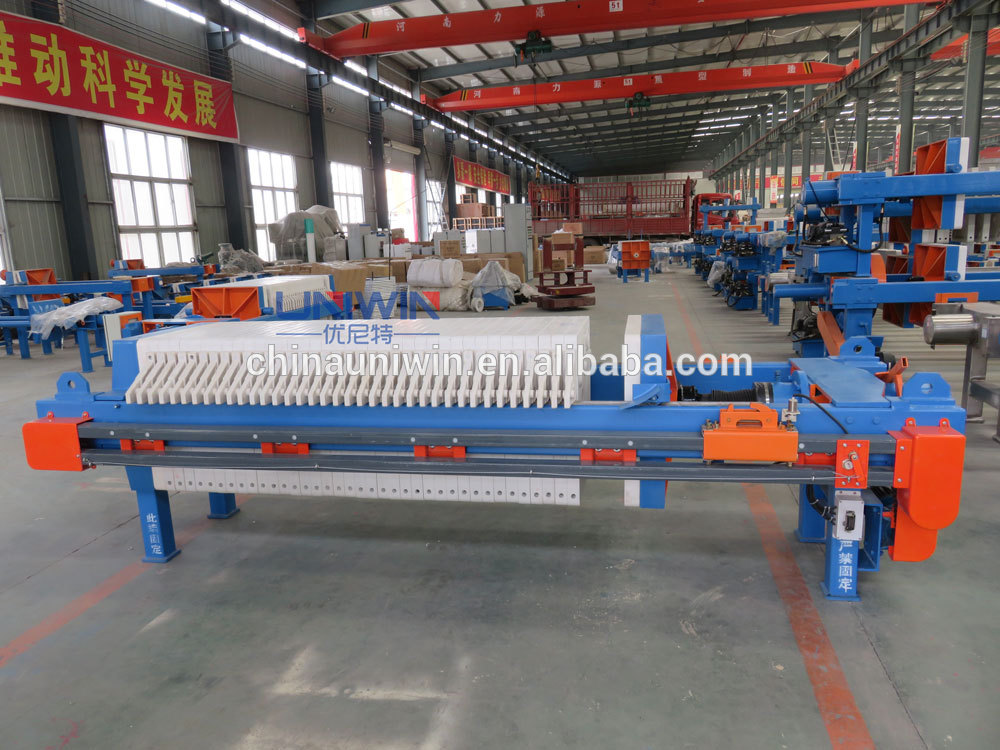 filter press is one kind effective filtration equipment for solid-liquids separation. compared with other solid-liquid separation equipment, the filter cake has higher solidity rate and good separation effect. Filter press structure is simple, it has the characteristics of large filtering capacity and have the filtering area from small to big (filtering area from 1 m2 to 1000 m2), high operating pressure, low filter cake moisture , applicable to a variety of materials, suitable for intermittent operation.