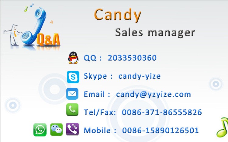 You can send inquiry to me . an contact with me by Cellphone/Wechat / Whatsapp /Viber:+86 15890126501 Skype :candy-yize,QQ : 2033530360 |