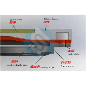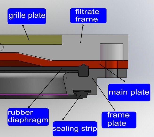 2, Extrusion: high pressure water fed into upper chamber of rubber diaphragm, make the diaphragm expand and extruding the cake and the liquid will be extruding out from cake.