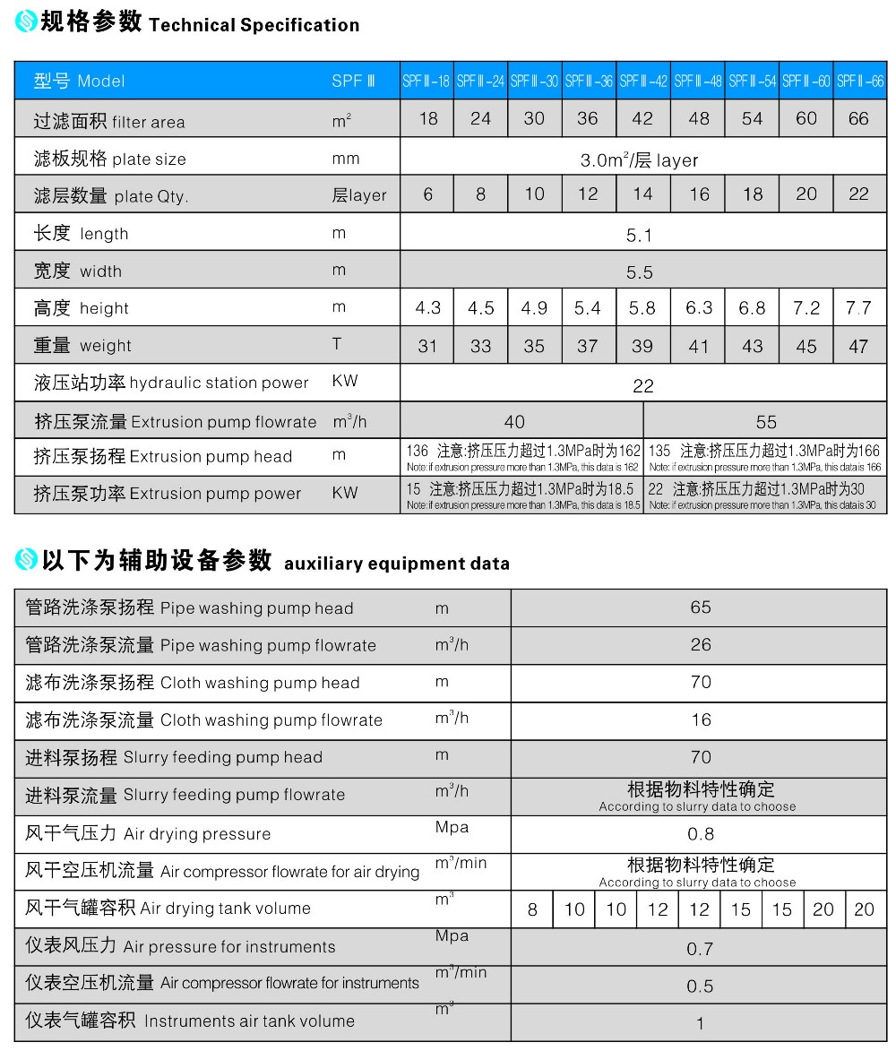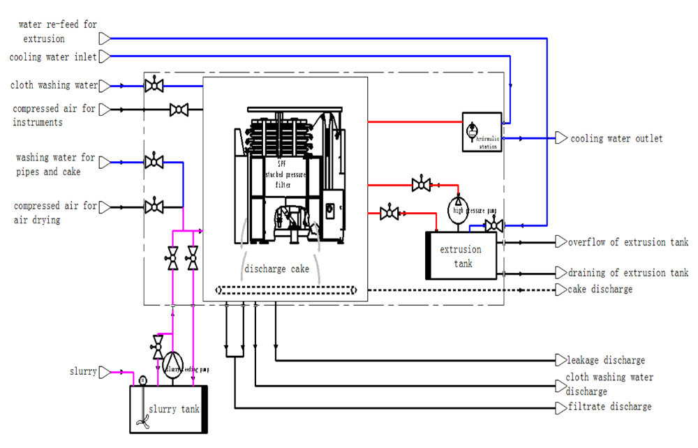 SPF stacked pressure filter is a kind of high-efficiency, energy-saving and intelligent solid-liquid separation equipment. It makes full use of the slurry feeding pump pressure, slurry properties and rubber diaphragm extrusion pressure, and use filter cloth as filter medium to separate the solid and liquid from slurry.