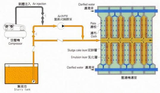 The membrane filter press filter chamber is composed of diaphragm plate and chamber filter plate. The slurry is fed into the filter chamber under the pressure of the feed pump and the solids and liquid in slurry are separated by means of a filter medium ( filter cloth) . When the solid in the filter chamber is fully pressed, and the water content is reduced.