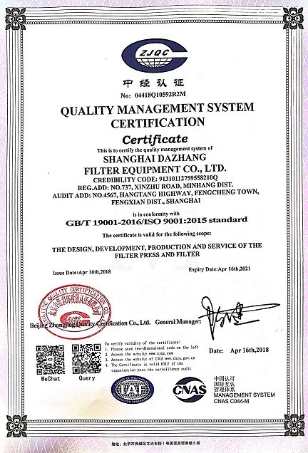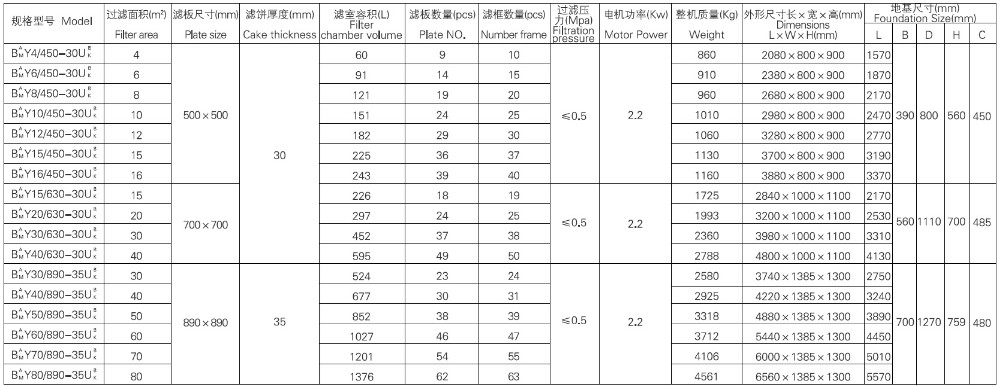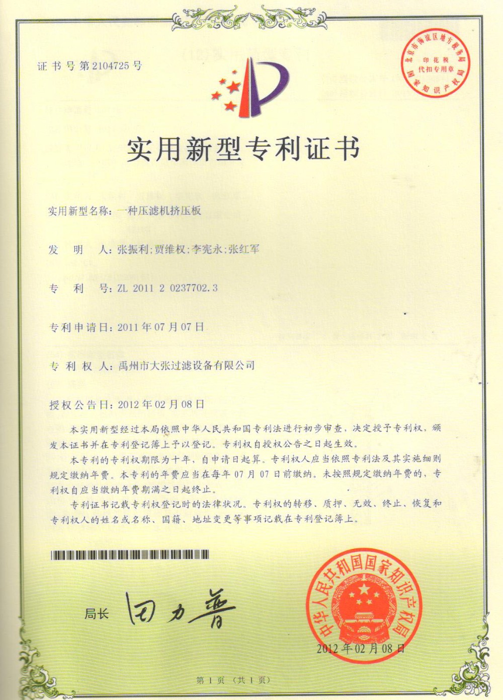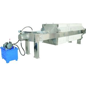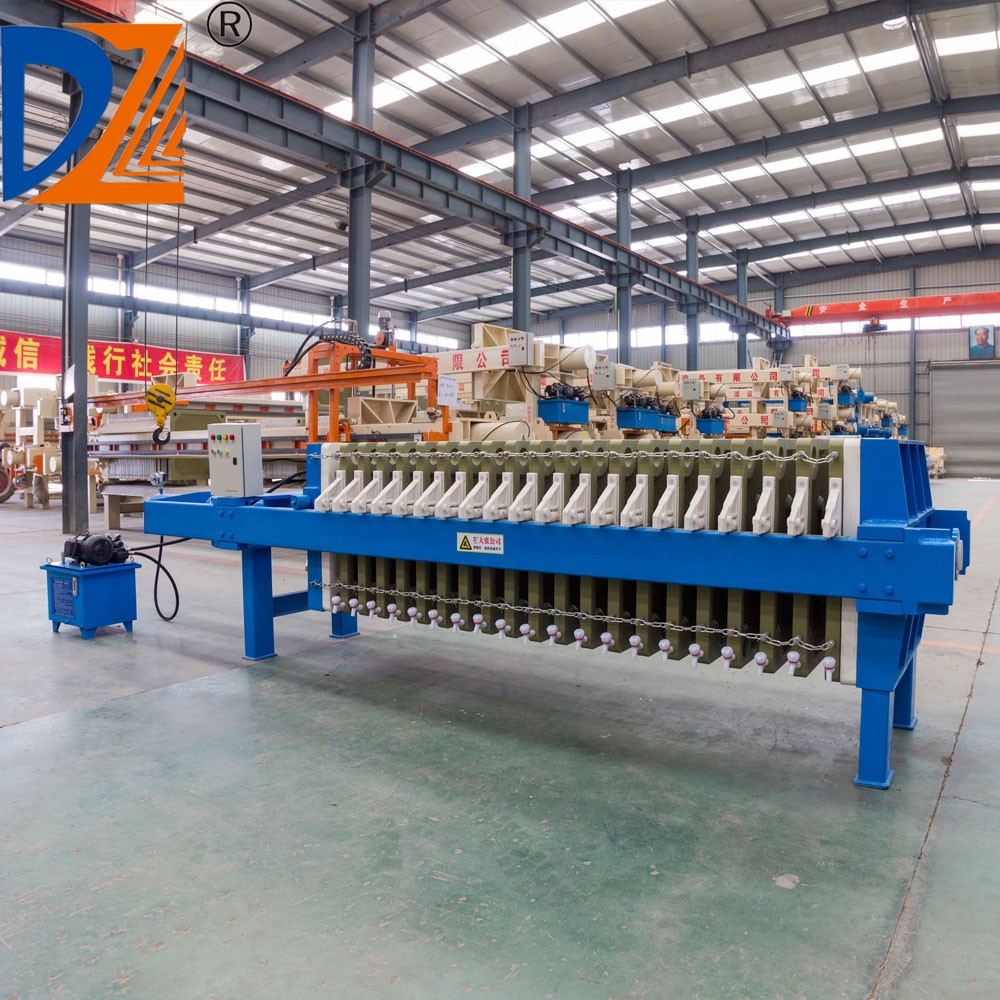 The Filter plate with filtrate pathway and filter frame are arranged in parallel alternately, each group of filter plate and filter frame is sandwiched with filter cloth, the filter plate and the filter frame are pressed tightly by pressing end, so that the filter plate and the filter plate form a pressure filter chamber. Sludge from the feed into the inlet, then water through the filter plate from the export of filtrate, mud cakes stacked in the filter cloth, filter plate and filter frame loosened after the mud cake is very easy to peel down. This filter press has many strong advantages: simple operation, cake with high solid rate, the powerful applicability.
