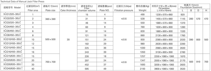 Plate and frame filter press machine technical data (Plate and Frame type)