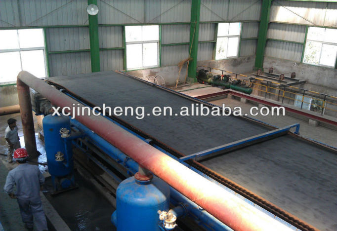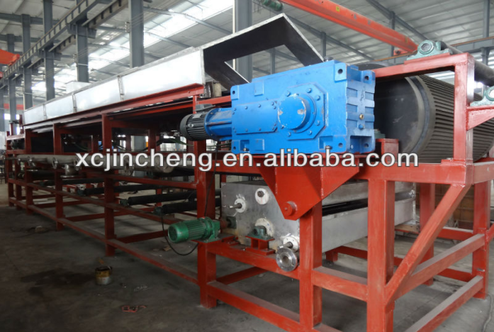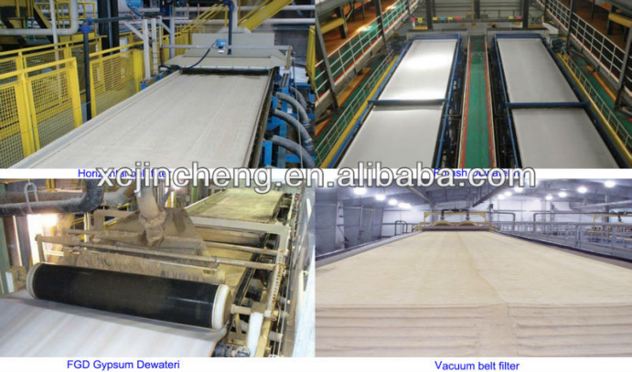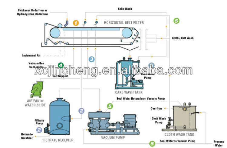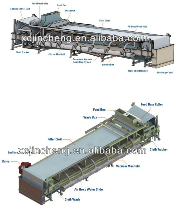 Horizontal rubber belt vacuum filter with filters as the filter media, is full use of gravity and vacuum suction material to achieve effective separation of the solid-liquid separation equipment. Ring of rubber belt vacuum chamber as a whole. Drag the ring belt from motor runs continuously, filter cloth dressing on the belt and run synchronously, tapes and vacuum skid pad ring contact friction belt and the formation of the water seal. Slurryby the distributor of evenly distributed on the filter cloth. when the vacuum chamber connected to the vacuum system, forming vacuum area on the tape, landfill leachate wearing summary and transverse grooves on the belt filter cloth by a small hole into the vacuum chanber, solid particles are withheld on the filter cake formation. Liquid discharge separator into the vacuum chamber, along with the rubber band to move, cake that has been formed in order to enter the filter cake washed area and dry area, finally separating filter cloth and adhesive tape, filter cake is discharge at the unloading roller. Discharged after washing, the cloth filter regeneration of filter cake, and then through a set of back-up roll and again after correcting device into teh filter area, began to enter new filter cycle.