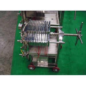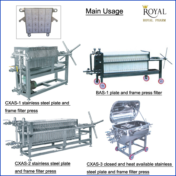 Yongquan Brand Model CXAS-1 stainless steel plate and frame filter press adopts 304 or 316L superior stainless steel materials for the manufacture. It is the first updating and upgrading product in China. It can only be produced by this factory with unique appearance design, novel internal structure, strong anti-corrosion performance, fine durability, long service life. Its function will be doubled after use. This product reaches the advanced international level. It can replace for the imported equipments. The sound when the machine runs is lower than 80Db(A). It is an ideal device for GMP and CGMP Attestation. It gains five state patents and national invention silver prize.