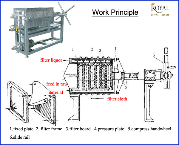 5. Easy to adjust: According to different production technology of products requiments (first-filter, half extractive filter, extractive filter), you can adjust the frame, board and filter medium of the filter machine. Also you can increase or reduce the frame, board and filter medium according to the flow of the liquid.