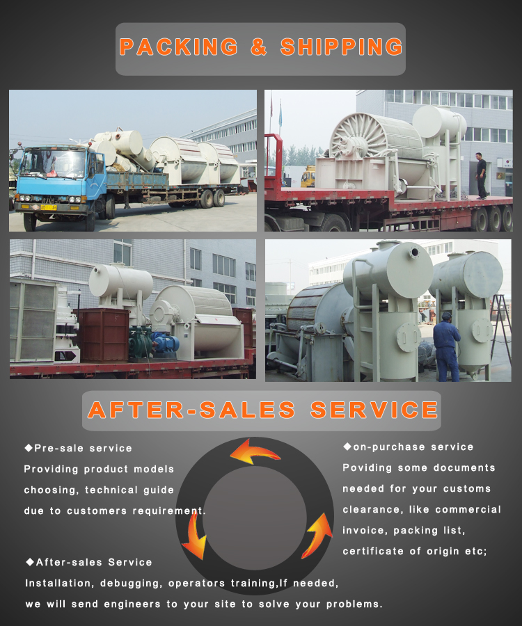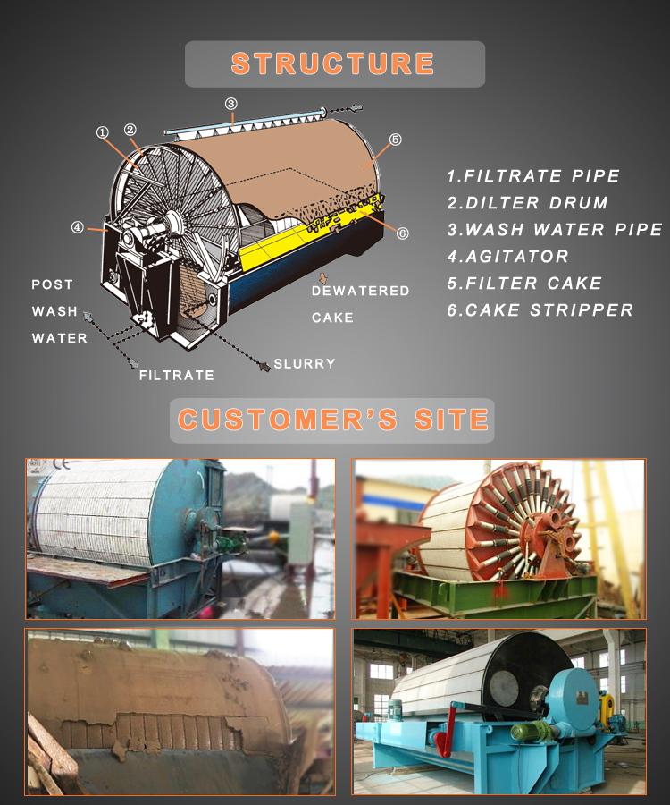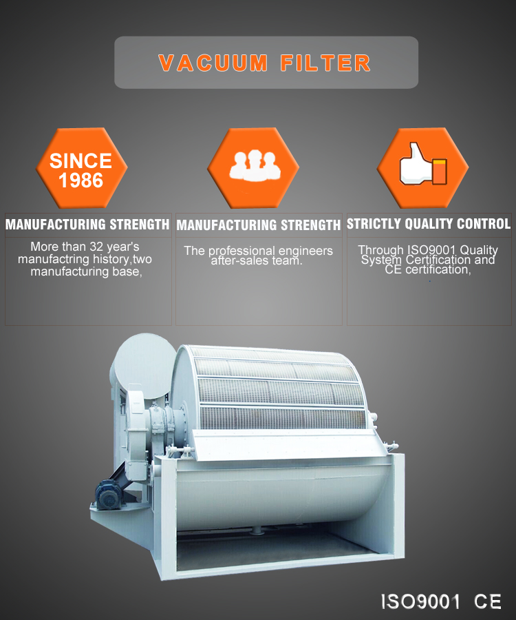 Operating principle of Vacuum Filter: The machine is mainly composed of drum, distributing head, slurry trough, mixer, drum transmission, mixer transmission, bobbin winder, discharge device and so on. At the effect of vacuum pump, the filter cause the pressure difference from the inside and outside of the filtering chamber, which makes the filter cloth on the surface of filter chamber be zone of negative pressure. The solid particle of the slurry inside the trough are absorbed on the surface of filter cloth and forms filter cake under the negative pressure, and the liquid is discharged by the vacuum pump along with gas. As the filter drum turns, the filter cake leaves liquid and the moisture continues being absorbed by the vacuum pump. When the filter cake turns to the discharge area, the pressure wind sucks it forming crack and then be scraped away. The filter cloth revives after being scraped filter cake because of the pressure wind. Then another circulation starts, entering the filter area, absorbing particle and forming filter cake. |