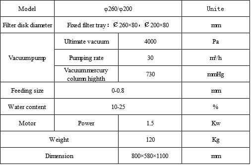 The disk vacuum filter mainly comprises vacuum pump, moisture air filter, vacuum negative pressure tank and two filter trays with automatic drainage device to be provided to separate solids from liquids. Two different filter disk with different capacity fit on the chassis, different amount slurry can be poured into the disks to filtering directly. The suck is active, located on the side of the chassis, connect by a hose to the chassis, it's use for the slurry precipitation extracting.