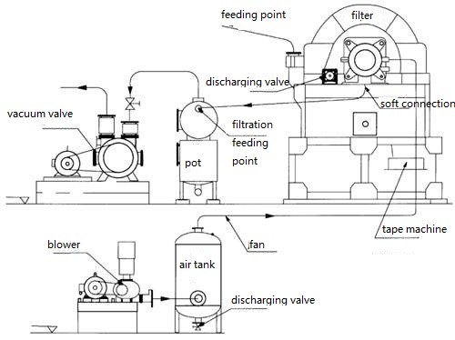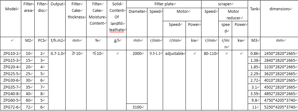 The filter disc rotates in the slurry tank When working. With the help of pressure difference generated by vacuum pump, the particle is absorbed on the cloth of the disc and forming a filter cake with a certain thickness. Filtration will discharge from the central shaft through the filter cake and cloth, and the filter cake will fall down under the pressure of the scraper and blower, and then drop into the discharging filter cake tank.