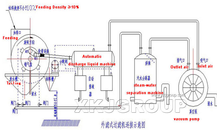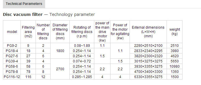 When working, the filter disc circles in the slurry tank. With the help of pressure difference generated by vacuum pump, the particle is absorbed on the cloth of the disc and forming a filter cake with a certain thickness. Filtrate will discharge from the central shaft through the filter cake and cloth, and the filter cake will fall down under the pressure of the scraper and blower, and then drop into the discharging filter cake tank.