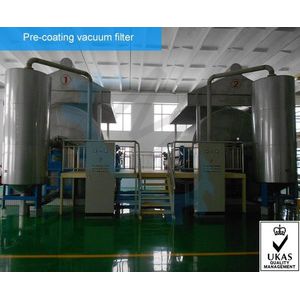 At first, on the surface of drum, a layer of pre-coat of filter aid like bergmeal or perlite should be formed evenly. Processing material is filtered into the bottom basin of the equipment. Under the function of vacuum, filter liquid goes through subsequently the pre-coat layer, filter cloth, imbibing tube, filter liquid collection pipe, and vapor liquid separator then enters into next processing section. Meanwhile the solid powder or other foreign impurities in the material is counterchecked by the pre-coat then removed by movable peeler continuously. When the thickness of the residual pre-coat is less than 10mm, it needs pre-coating again.