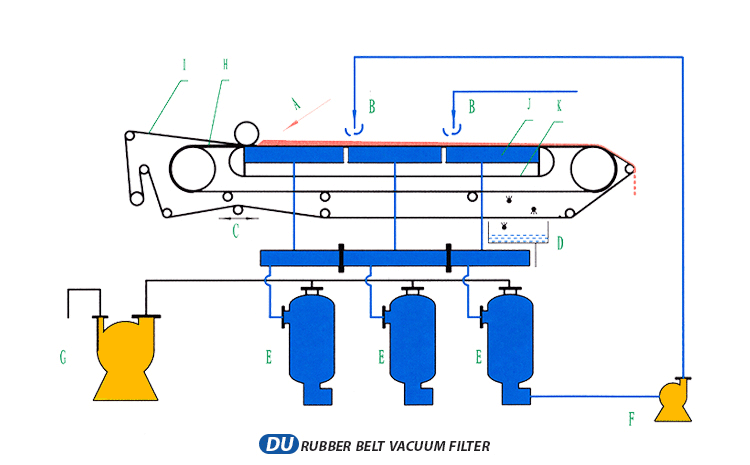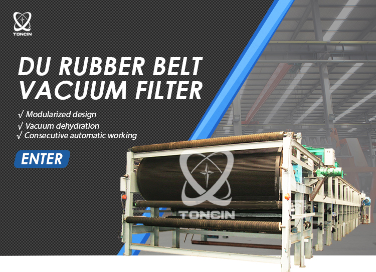 DU series Vacuum Rubber Belt Filter is a high automatic and new-type solid-liquid separation machine, using vacuum negative pressure as impetus to separate the solid and the liquid. Filter cloth only allows the liquid and the air to flow through but not the solid . The filter district can finish the procedure of filtering, residue unloading and filter cloth cleaning with high efficiency, high output, good rinsing effect, low moisture, smart operation and low repair cost.