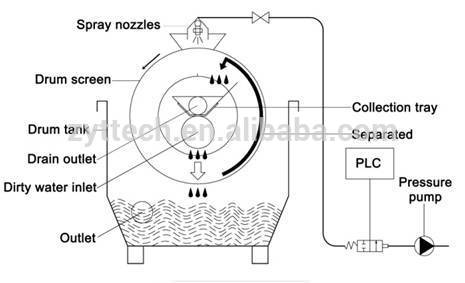 Filtration of the water level difference inside and outside of the drum due to gravity, slowly rotating around its own drum while flowing through the filter solid particles and other pollutants out of the inner surface of drum sticks. During rotation, the particles from the surface with the help of high-pressure spray nozzles cleaned and collected in a tray. This process prevents the degradation of the soft organic particles and increases the efficiency of the filter.