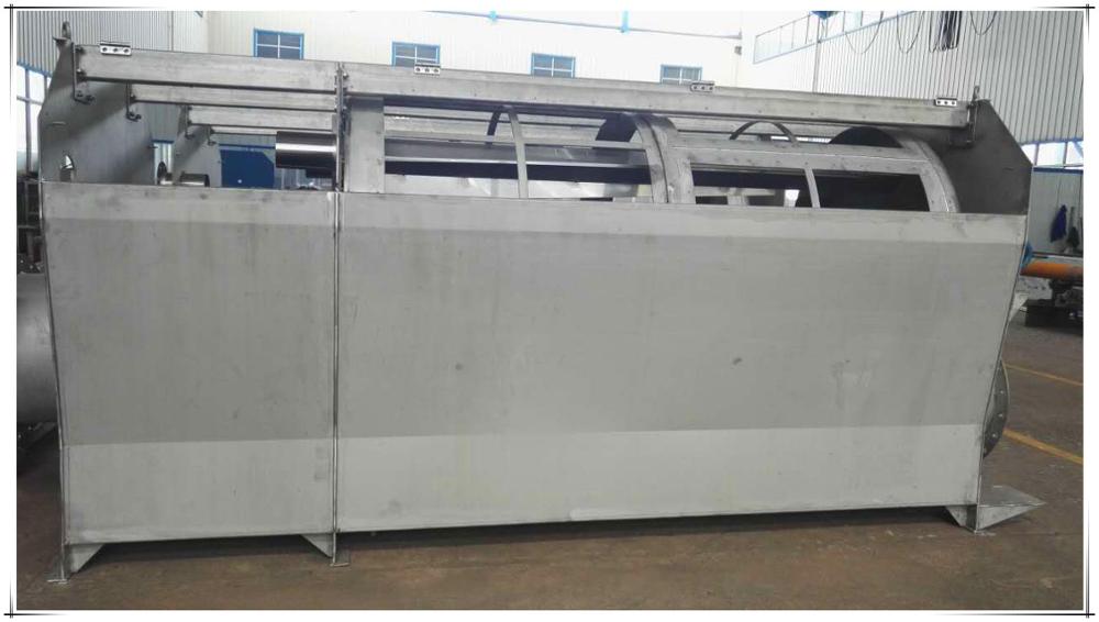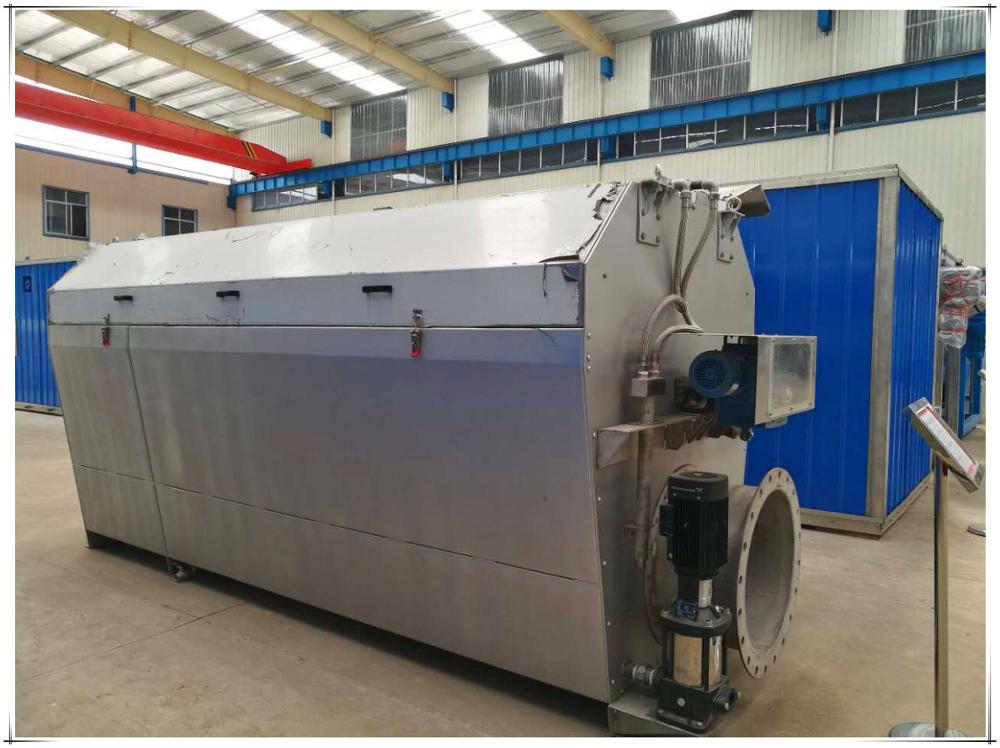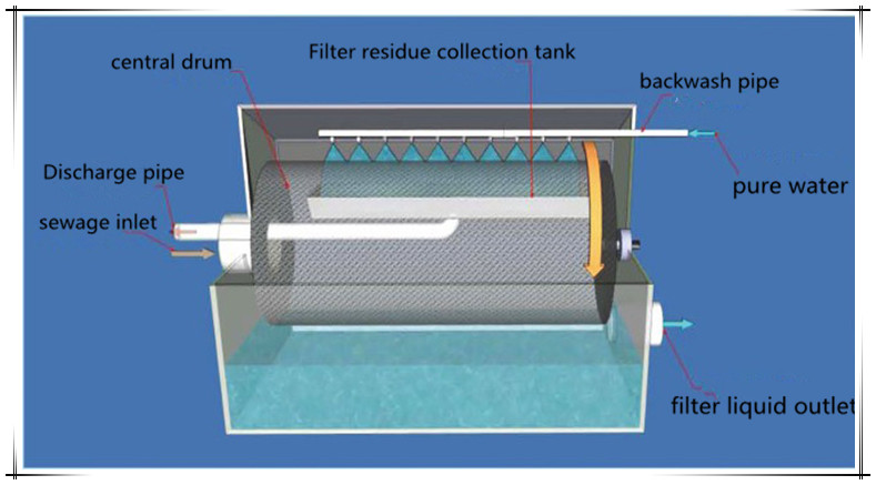 It is continuous filtering, the device is equipped with automatic start switch, when the drum into the water, the liquid level sensor sends a signal to start the deceleration drive system to drive the drum rotation, and start the backwash pump. Sewage into the hollow drum, the drum is a high degree of stainless steel filter. Sewage from the inside of the filter to the outside of the effluent, suspended solids in the sewage was trapped inside the filter. The rinse water is rinsed from the outside of the screen through the nozzle at the top of the drum. The rinsed fine particulate matter is collected by the backwash water collection tank inside the equipment and discharged through the sewage pipe. When the sewage passes, the device will automatically stop.