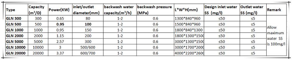 The equipment used in the last process of water treatment facilities, As an ultra-clean equipment. it belongs to the end of the total processing , but the equipment of the water requirements is: SS ≤ 100mg / l