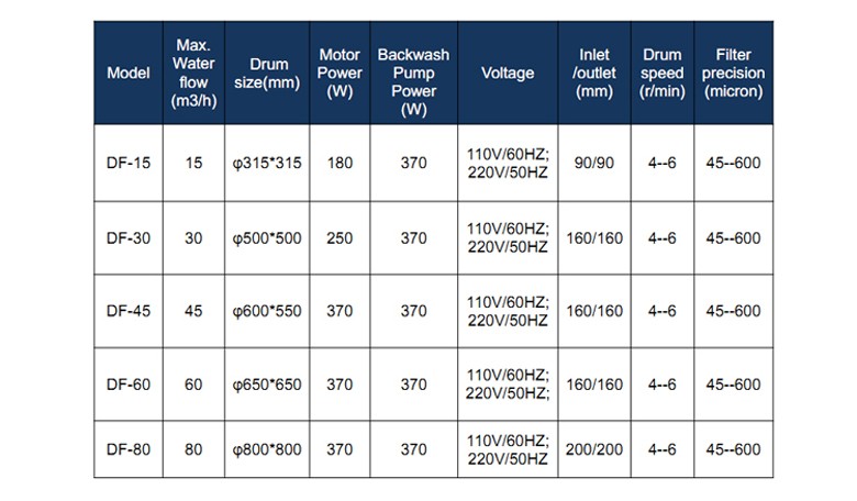 Rotary Drum Filter is used for mechanical filtration. It can separate solids, suspended substances(including feces, food waste and other organic water) over 30μm from water. The particles are filtered as the water flow through the sieve. The rinsing system washes the wastes away from the sieve automatically and keeps the drum running efficiently.