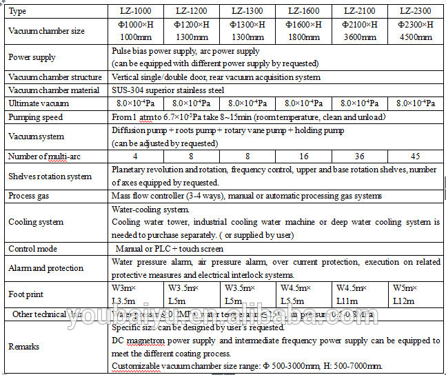 Diffusion pump, Rotary vane pump, Roots pump, Holding pump, Slide valve pump, Magnetron sputtering power supply, Unipolar pulse bias power supply, Arc power supply, Vacuun gauge, Ultrasonic cleaners, All kinds of targets, valves etc.
