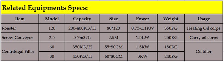 Roaster(heating) => Screw conveyor =>oil presser =>Centrifugal Oil filter