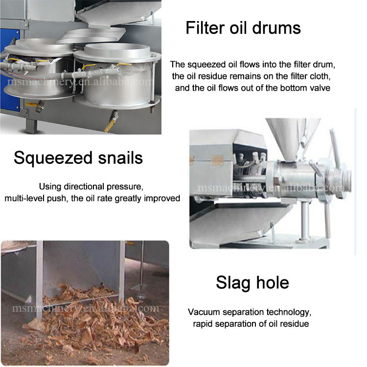 Automatic Plant Seeds expeller palm oil press is used to both cold press and hot press many materials. It can be used to press various kinds of oil corps, like rapeseed, cottonseed, soybean, peanut, sesame seed, coconut, olive fruit, sunflower seeds, walnuts, almonds, tea seed, etc.