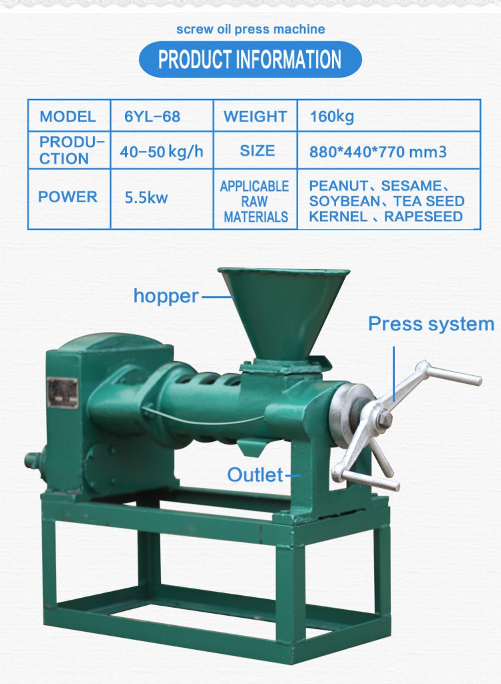 | 6YL-68 | 40-50Kg/h | 5.5KW | 380V/50HZ/Triple phase | 880*440*770 | 160/140 |