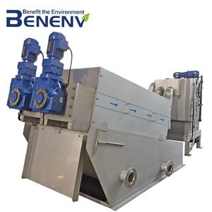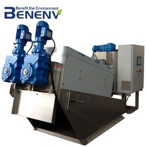 Multi-Disk Screw Press( Hereinafter referred as MDS ) belongs to the screw press, it's clog-free and can reduce the sedimentation tank and sludge thickening tank, saving the cost of sewage plant construction. MDS using screw and the moving rings to clean itself as clog-free structure, and controlled by the PLC automatically, it's a new technology that can replace the traditional filter press like belt press and frame press, the screw speed is very low, so it cost low power and water consumption in contrast to the centrifuge, it is a cutting edge sludge dewatering machine.