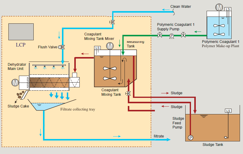 Polymer and sludge are thoroughly mixed in Coagulant Mixing Tank, from there, the flocculated sludge moves into