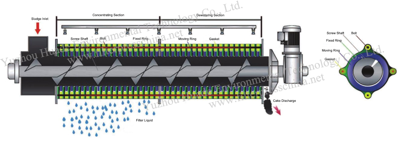 Sludge in concentrating section after gravity concentration, transported to dewatering section, in the process of forward, filtering seam and screw pitch became smaller, as well as the back plate blocking, create great pressure, volume shrinking, achieve the goal of fully dehydration