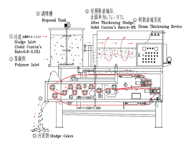 Mainly used to treat sludge which is ready to be concentrated through rotating and concentrating(e.g. residual sludge in Method A/O). This equipment has double functions of sludge concentrating and dewatering,and its treating capacity increase more than that of old press filter.