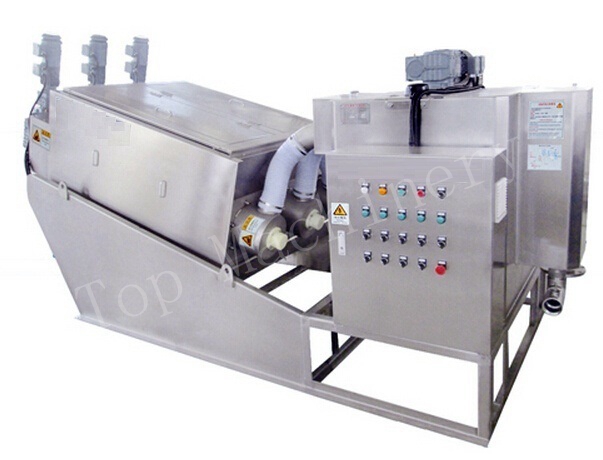 Volute Sludge Dewatering Machine( Hereinafter referred as TPML ) belongs to the screw press, it's clog-free and can reduce the sedimentation tank and sludge thickening tank, saving the cost of sewage plant construction. TPMY using screw and the moving rings to clean itself as clog-free structure, and controlled by the PLC automatically, it's a new technology that can replace the traditional filter press like belt press and frame press, the screw speed is very low, so it cost low power and water consumption in contrast to the centrifuge, it is a cutting edge sludge dewatering machine.