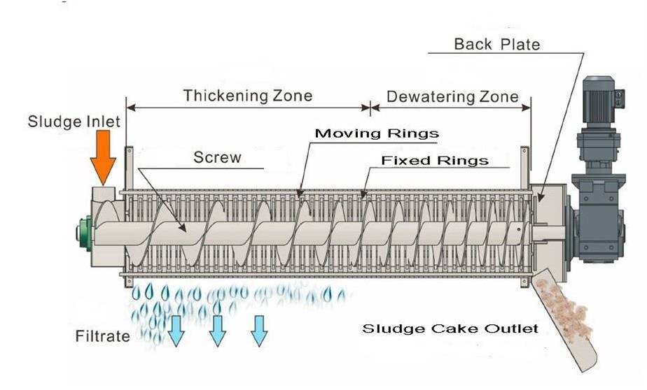 When the machine starts runing, the sludge will be pushed into the filter cartridge from the feed inlet and then moves to the sludge cake outlet. The pitch of the screw narrows and the gaps between the rings decrease towards the end-plate where sludge cakes are discharged. The pressure in the dewatering drum increases, then the water comes out from the gaps between the fixed rings and moving rings. Depending on the self-clean function, the machine can clean the filter gaps automatically to avoid block. The sludge cake will be well dewatered and discharged from the outlet with push of the screw. |