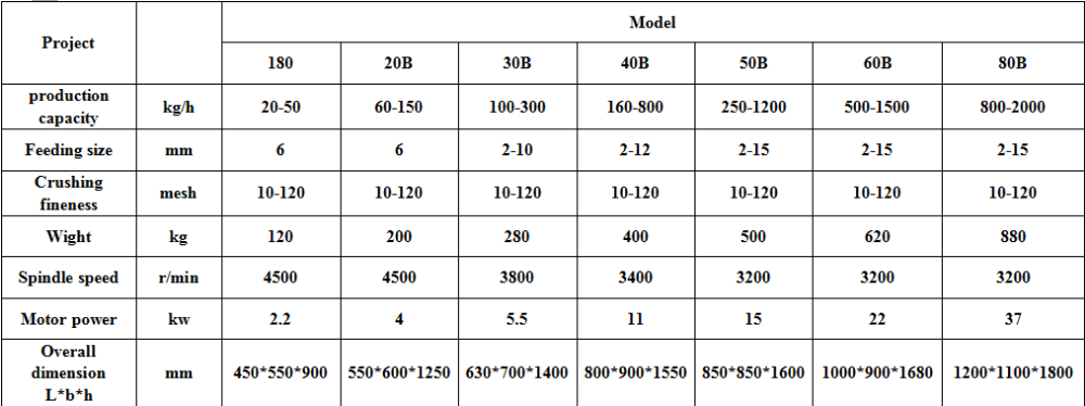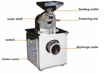 The electrical motor of the grinderdrives the main shaft to rotate at a high speed and spin off the material into the grinder, The material is ground between the moving plate and the fixed plate by striking, shearing and grinding, The ground material is carried by the air flow through the screen to the collecting bag. The size of the particle can beadjusted by changing the screen with different screen
