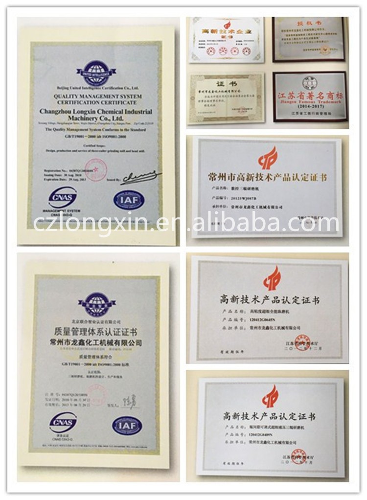 Changzhou Longxin Machinery Co.,Ltd owns various honorary status, including high-tech enterprise, national special ultra-fine powder technology researching center, micro-nano material preparation engineered and industrialized testing site, and vice chairman unit of Chinese Ink Association. Longxin machines are with certifications of TüV, BV, CE and ISO9001:2008.