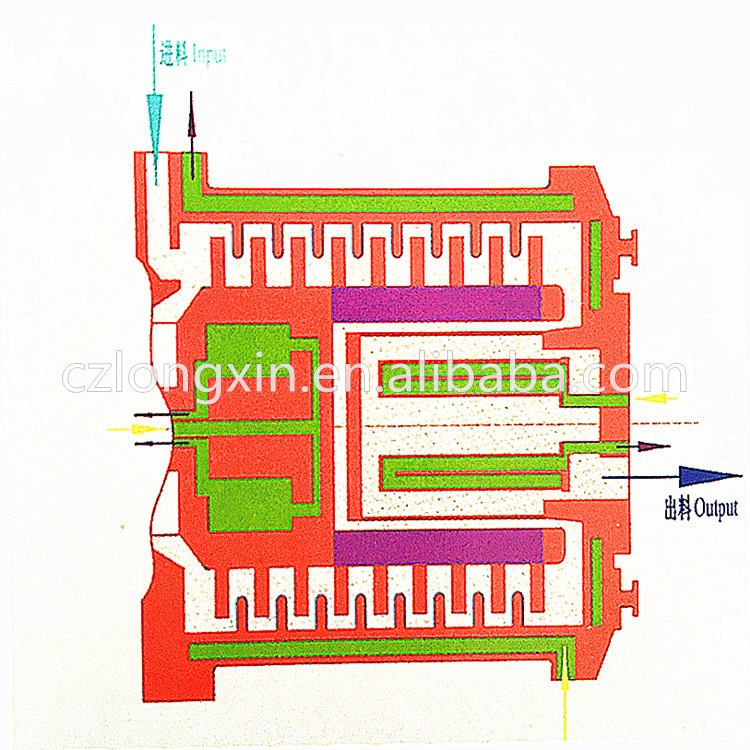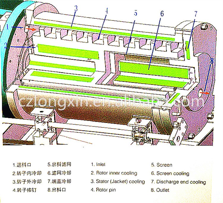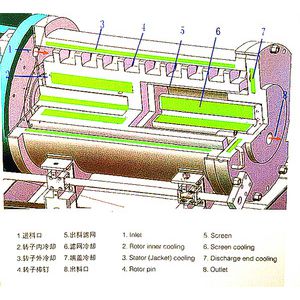 Materials are fed from the top inlet to the grinding chamber by feeding pump and distributes evenly with the rotation of the rotor, the eddy current works on the materials for completely pre-dispersion under the action of centrifugal force of rotor and stater. The rotor and stater have strong impact on the grinding media and meanwhile the grinding media work on the materials.The materiald stay in the grinding chamber after certain grinding time, resulting in a very narrow particle size distribution. Because of different density, grinding media return to the grinding chamber under the effect of feeding pump pressure and centrifugal force, while the materials flow out through the screen separator on the opposite direction of the centrifugal force, this is a re-circulation..